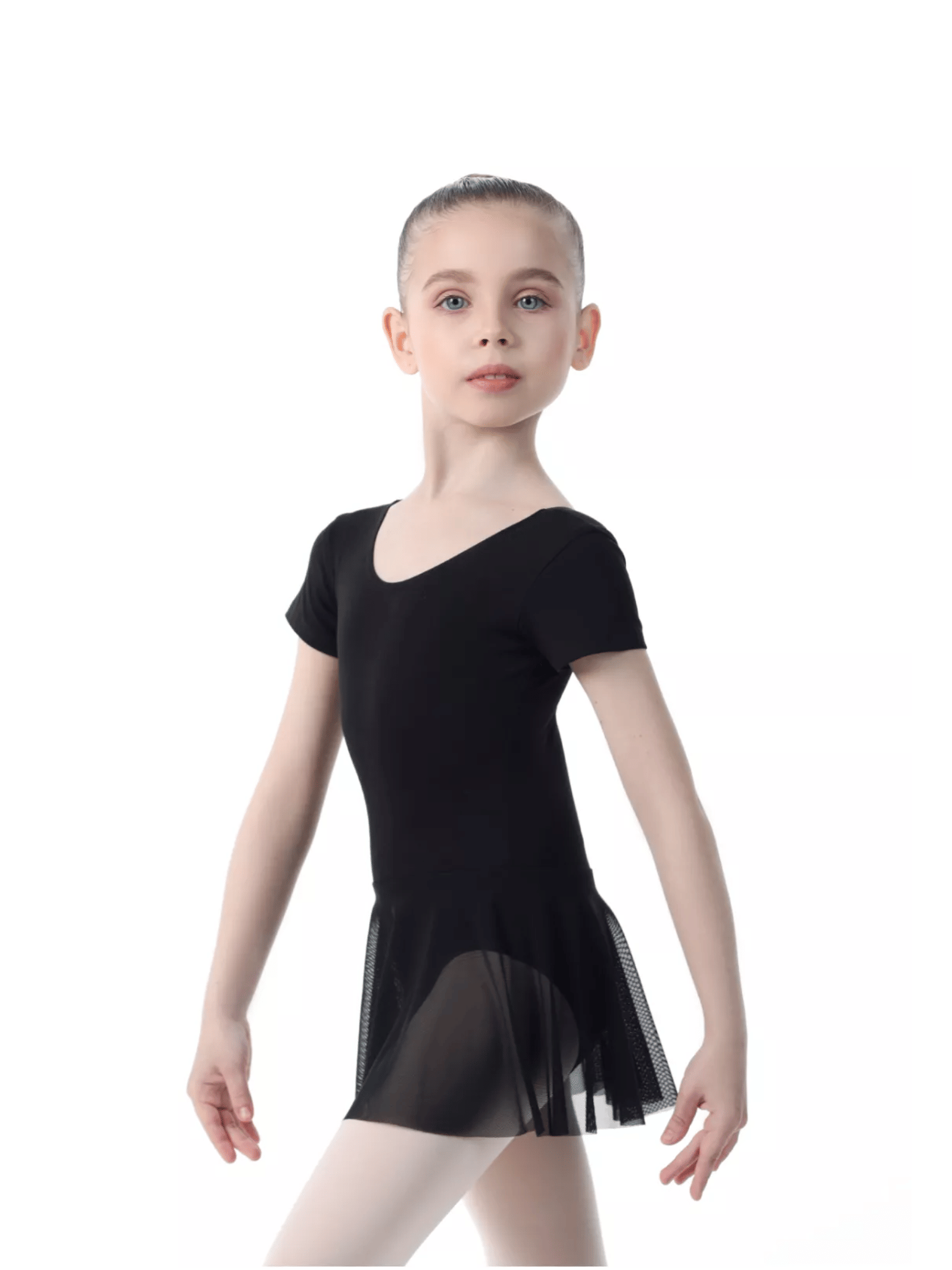 Классическая модель купальника белого или черного цвета с полупрозрачной юбкой- солнце из сетки, с короткими рукавами. Круглый выкат спинки до середины лопаток, средний окат ножки.